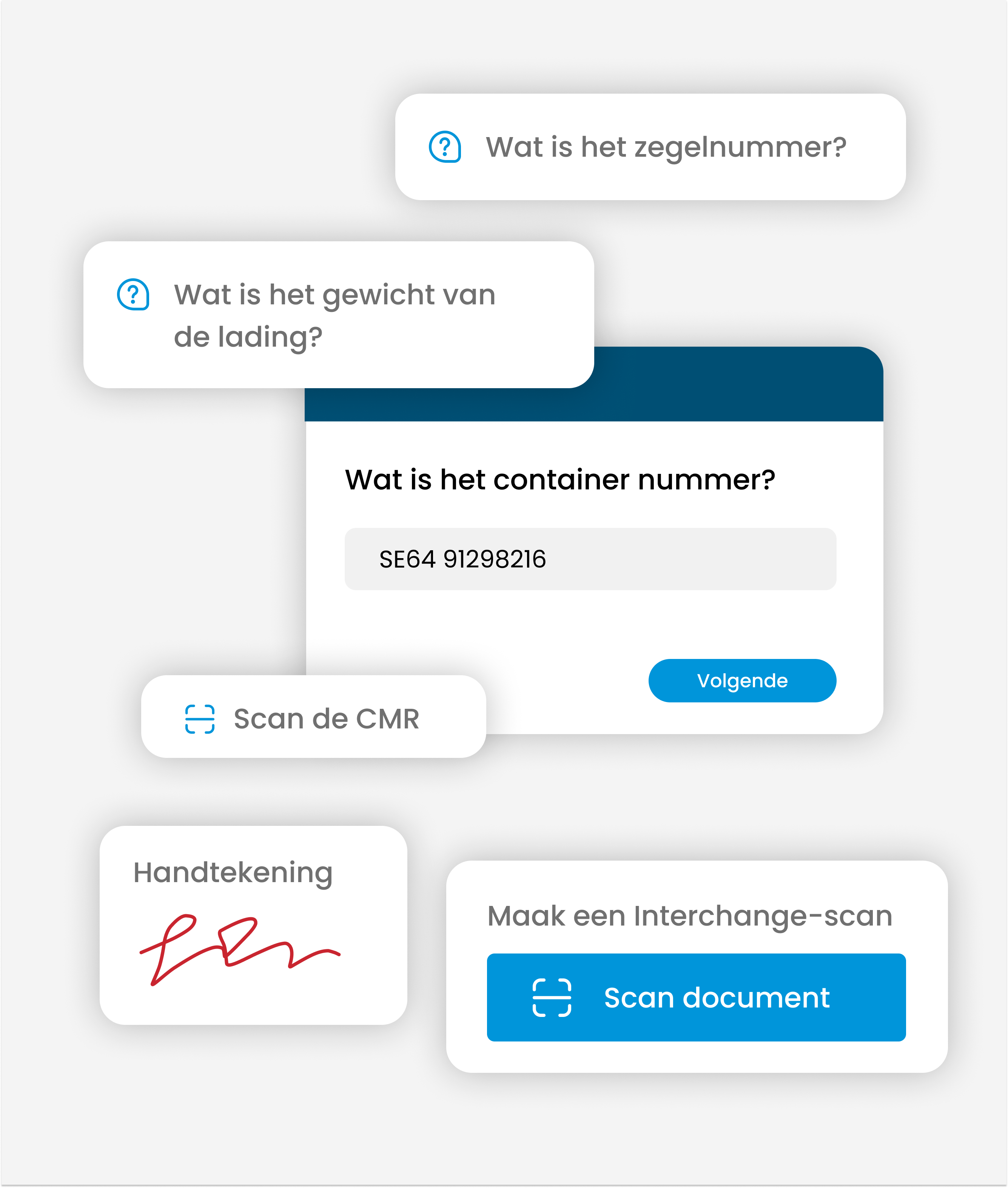 Denk aan het vastleggen van het zegelnummer en containernummer, het maken van een CMR-scan, het zetten van een digitale handtekening bij levering of het beantwoorden van specifieke vragen bij afwijkingen. Zo wordt altijd de juiste informatie op het juiste moment geregistreerd.
